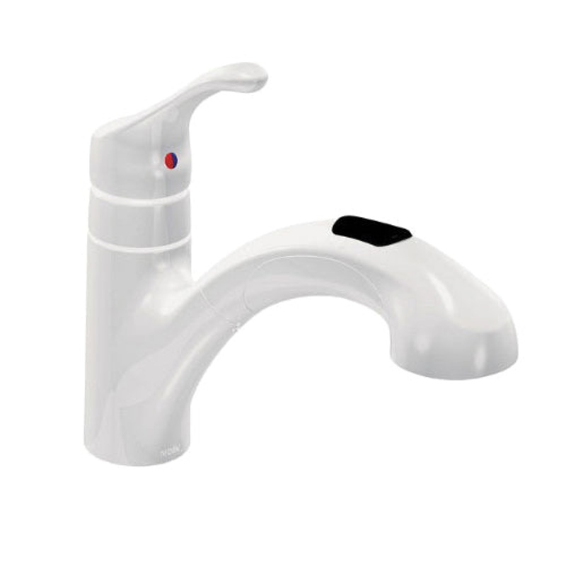 Moen Kitchen Faucet, Renzo Collection, Faucet Configuration: Pull-Out, Theme/Style: Seamless, Deck Mounting, Manufacturer Finish: Glacier, Finish Family: No Finish, 1-Handle Handles, Lever Handle Style, 1.5 gpm Flow Rate, 7-5/8 in Spout Height, 9-5/8 in Spout Reach, Low-Arc Spout, 2 in Maximum Deck Thickness, 3/8 in Connection, IPS Connection, Low Lead Low Lead, ADA Compliant, Additional Information: 2-Spray Functions