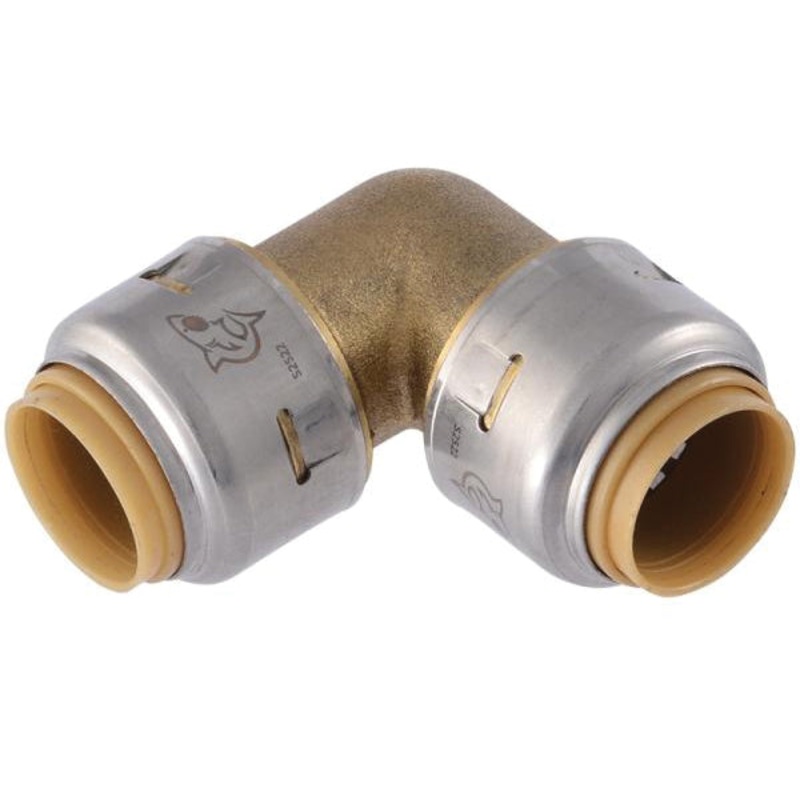 SharkBite Max 90 deg Elbow, 90 deg Elbow Fitting, Connection Size 1: 3/4 in, Connection Type 1: Push-Fit, Connection Size 2: 3/4 in, Connection Type 2: Push-Fit, Push-Fit|||Push-Fit Connection, Brass, Material Construction: Brass, For Use With: PEX, Copper, CPVC, PE-RT or HDPE SDR-9 Pipes, 2-1/2 in L x 2-1/2 in H, 400 psi, 200 deg F